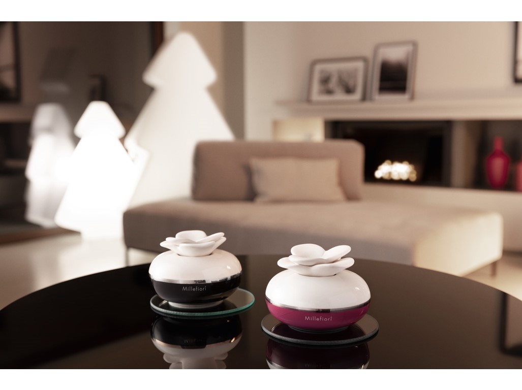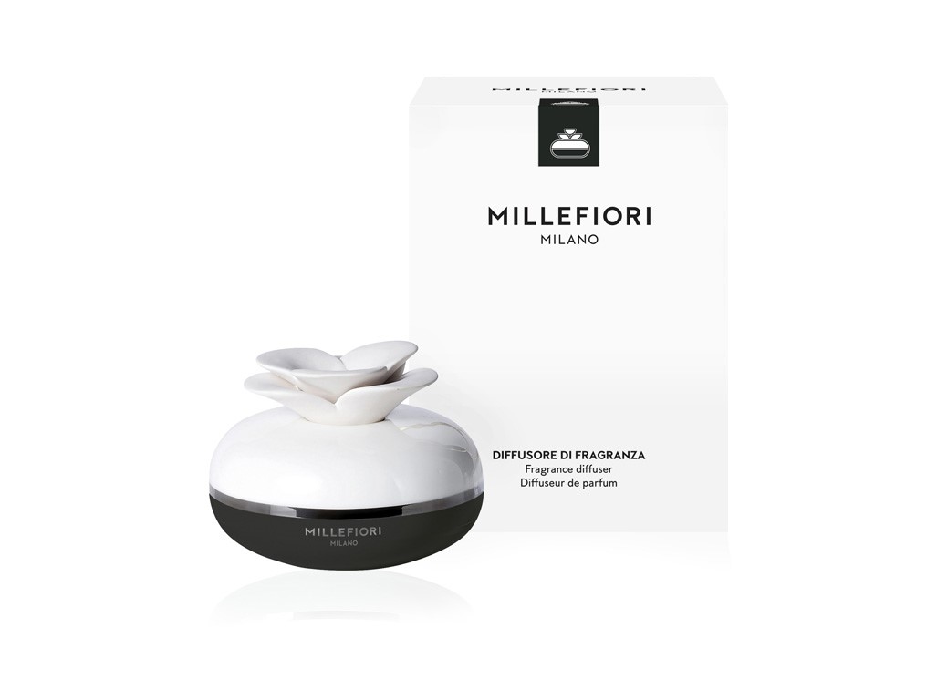 Mini difuzér květina z glazované keramiky a sádrovou květinou se hodí do menších prostor jako je koupelna či toaleta a je to také perfektní dárek. Krásné dárkové balení neobsahuje vonnou náplň, tu si můžete vybrat podle své nálady v některé z kolekcí Millefiori. Místo tyčinek používá tento typ difuzéru neglazovanou květinu, která vtahuje vůni do prodyšného sádrového uzávěru, ze kterého jí uvolňuje do prostoru. Náplň nalijte do nádobky přibližně do 3/4 objemu a difuzér uzavřete květinou. Doporučujeme použít podložku nebo postavit před naléváním nádobku do dřezu, aby nedošlo k poškození povrchu nábytku. Některé vonné esence mohou bílý povrch květiny lehce zabarvit.