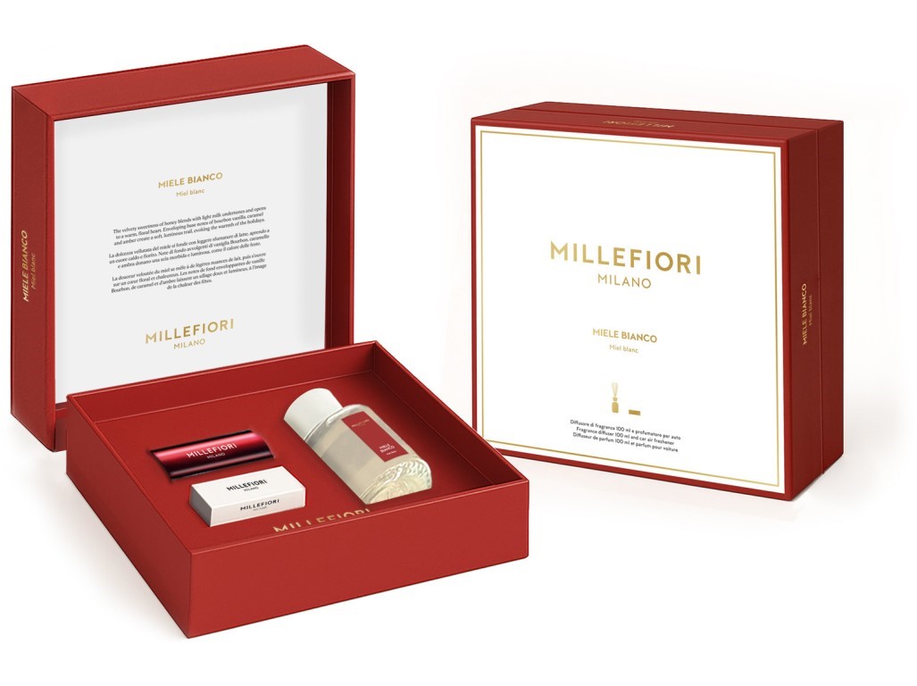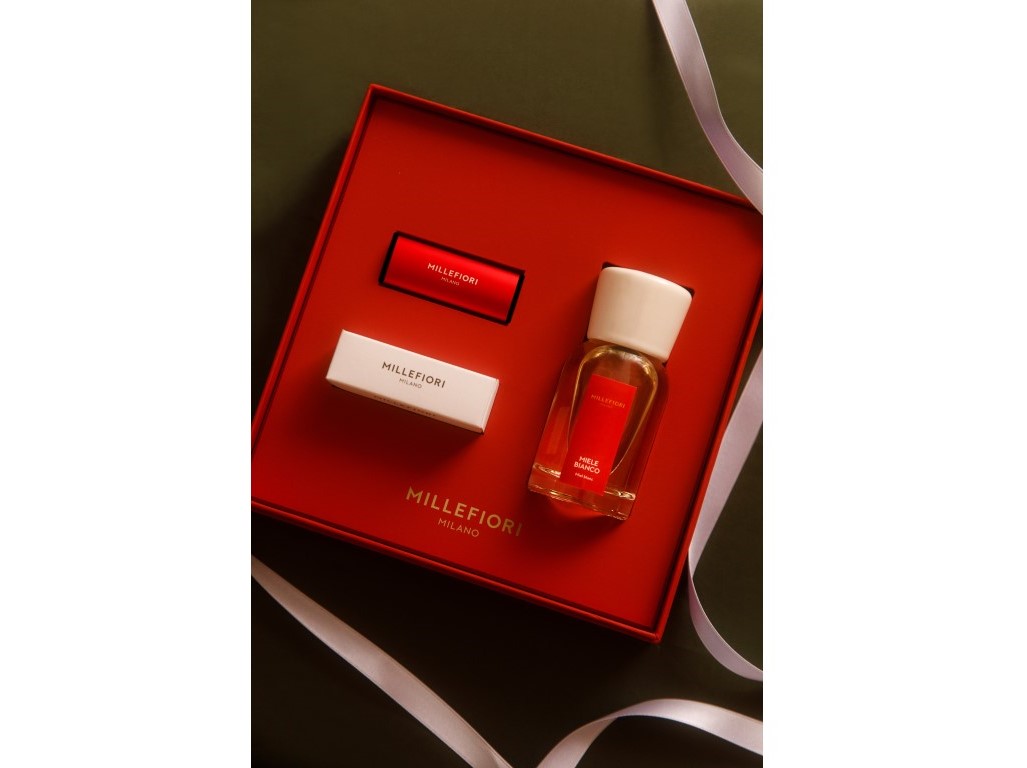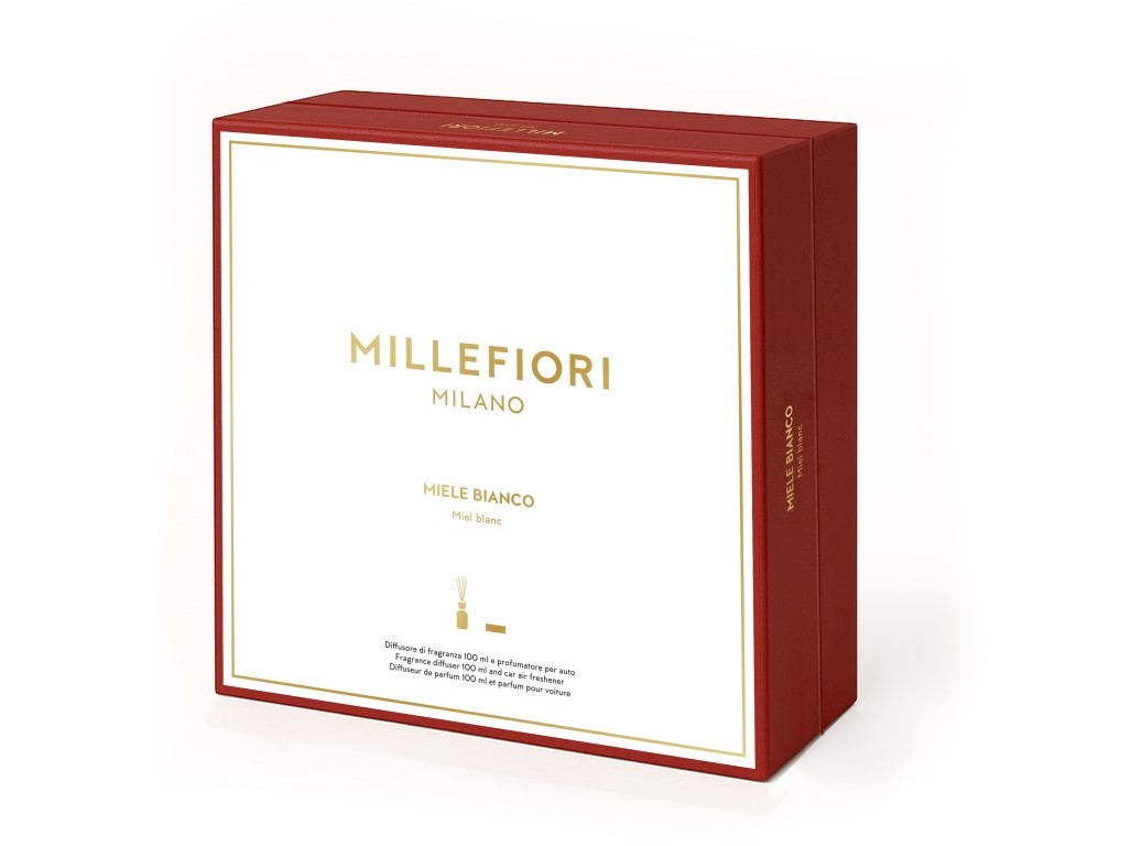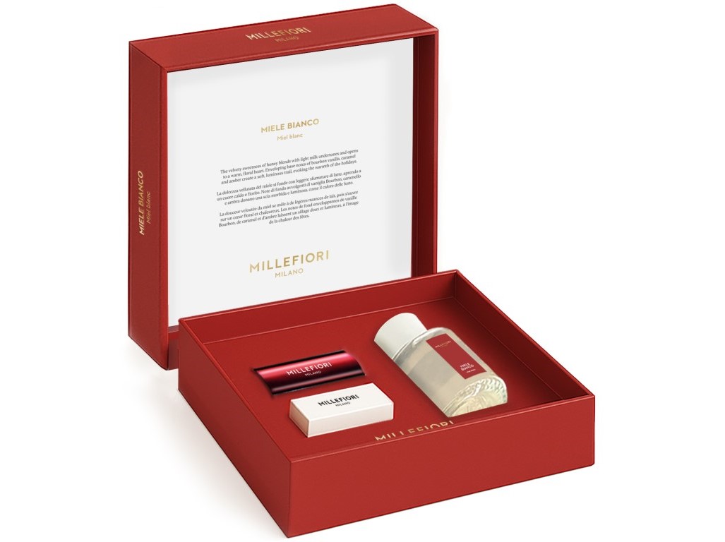 Nádherně zabalená dárková sada Millefiori Milano s elegantními detaily obsahuje difuzér 100 ml s jedinečnou vůní Miele Bianco a vůni do auta Icon, která okamžitě promění váš interiér i cestu v harmonický zážitek. Vychutnejte si chvíle klidu a radosti, které evokují okamžiky zastavené v srdci zimy – mezi teplým světlem, tichým smíchem a jemností sdílených vzpomínek. Vůně spojuje svěží akcenty s hřejivými tóny a vytváří tak atmosféru plnou pohodlí a elegance, která potěší každého milovníka vůní.